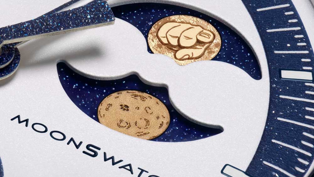 Mission to Earthphase – Moonshine Gold richiama molte delle caratteristiche iconiche dello storico Speedmaster Moonwatch di OMEGA: la cassa asimmetrica, la celebre scala tachimetrica con il punto sopra il novanta e una precisione che omaggia l’avventura lunare originale. Il quadrante bianco opaliescente è impreziosito dai loghi OMEGA X Swatch e dalle grafiche dedicate alle fasi della Terra e della Luna, con tocchi di Moonshine™ Gold e dettagli che si illuminano grazie al Super-LumiNova® di grado A.